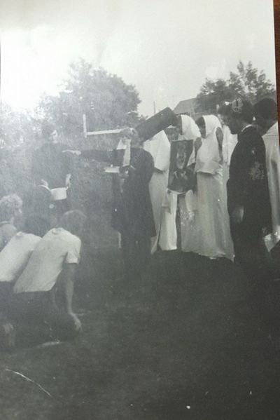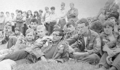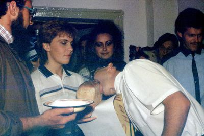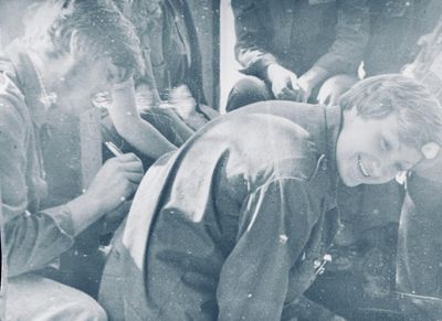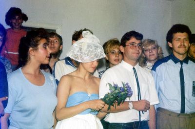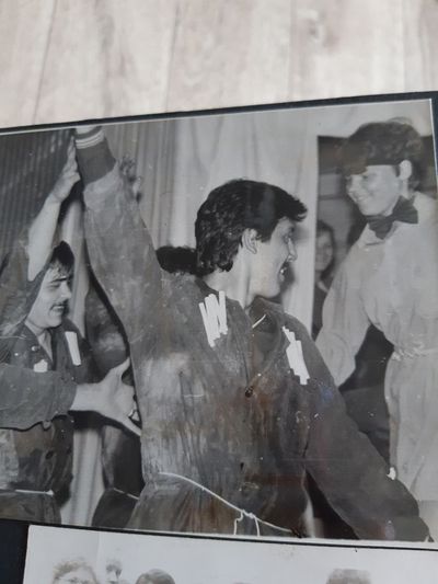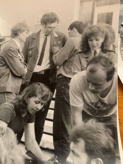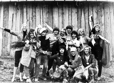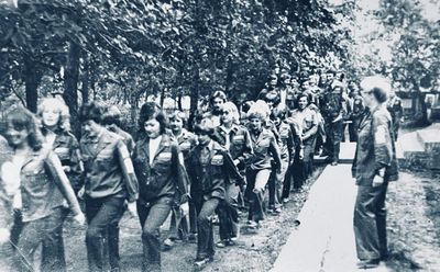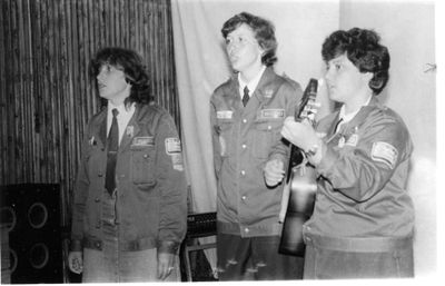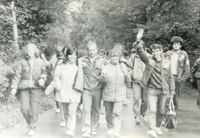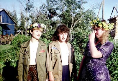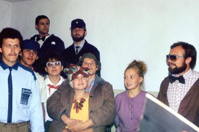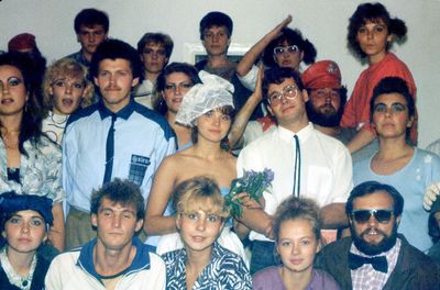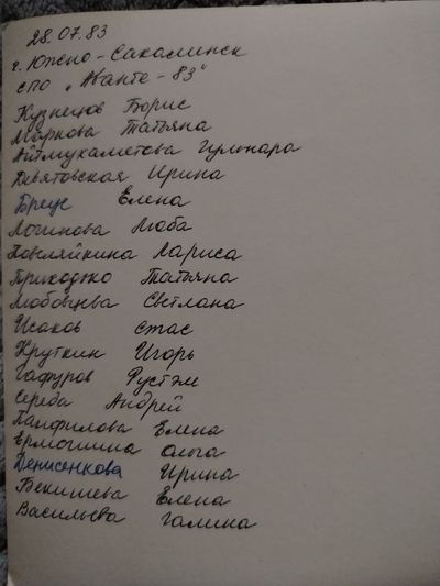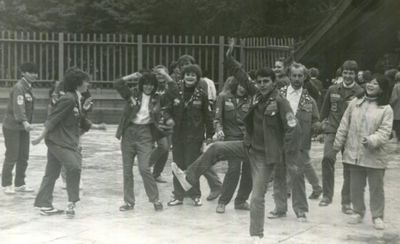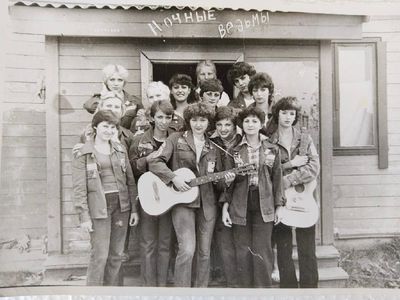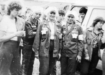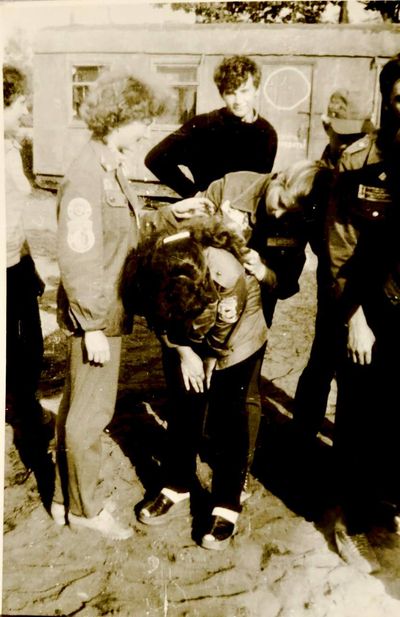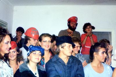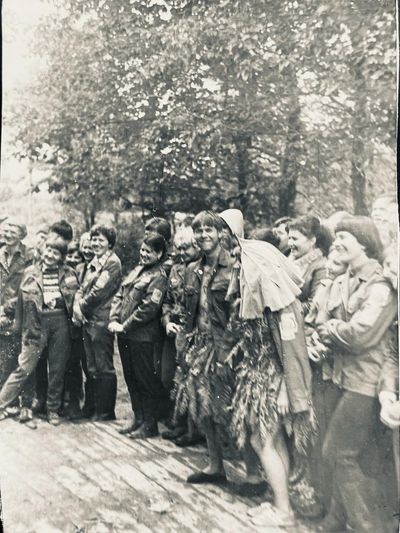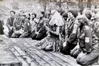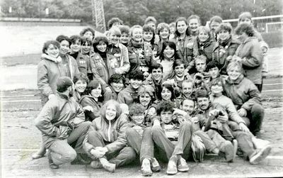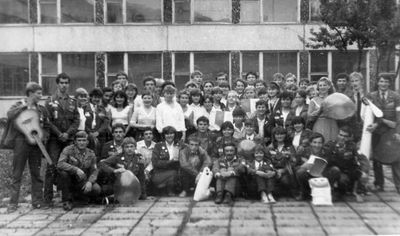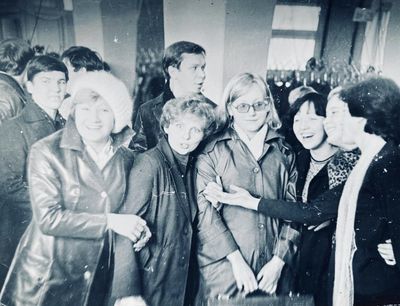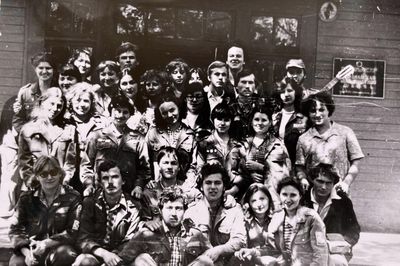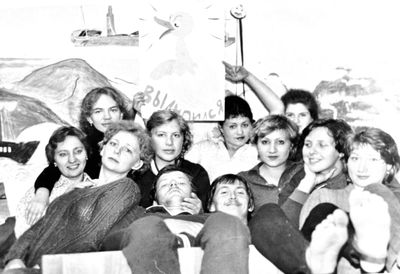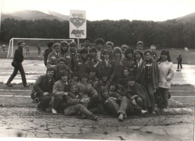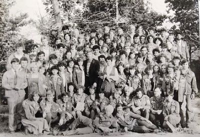 Аванте 81 Посвящение Слева направо -> Ягодин Олег Зятьков Саша Горчакова ? Освинцевав Лена Дмитриенко Игорь Маценко Наташа Доценко Люба Щеткина Галя ? -> Павликов Боря Гутова Марина Козлова Наташа Больных Ольга Дальше размыто ?