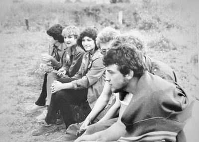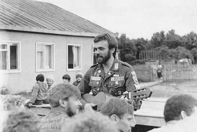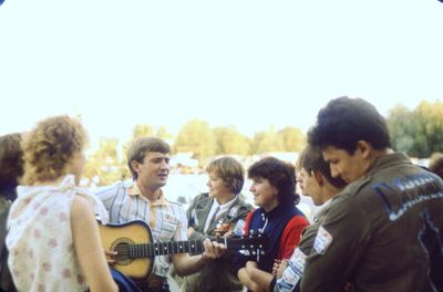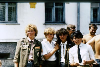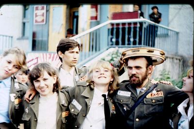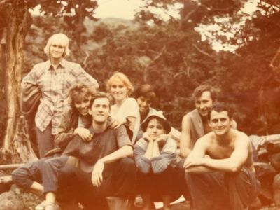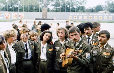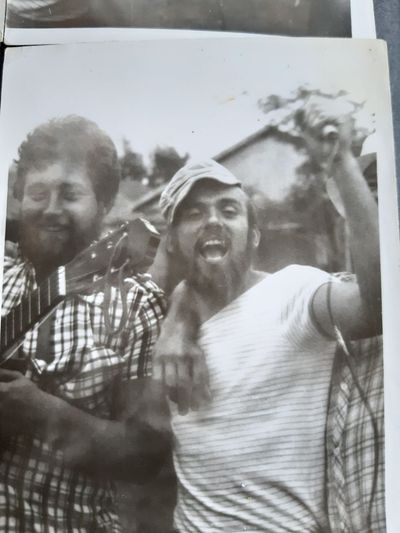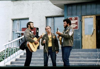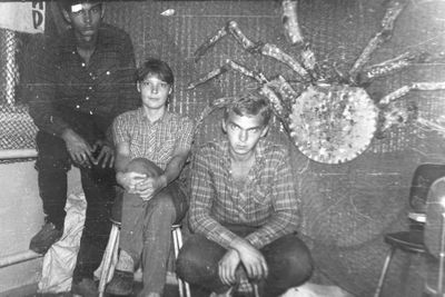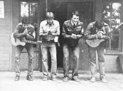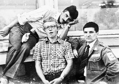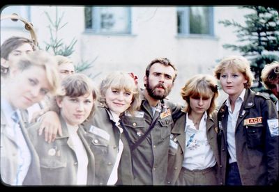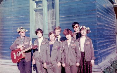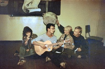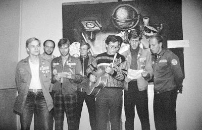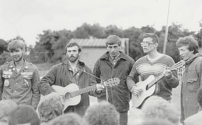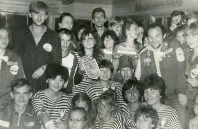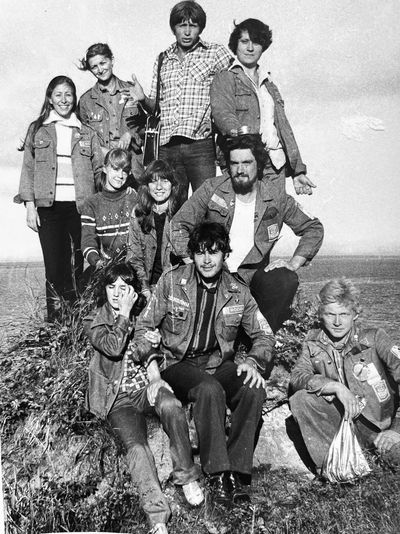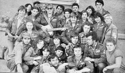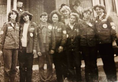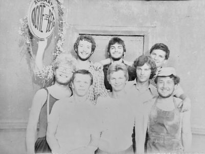 Агитбригада Аванте 81 Первый ряд Дмитриенко Игорь Арумс Слава За ними Сакович Степа в полосатой рубашке Слева ? Наверху Калевинский Владимир