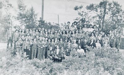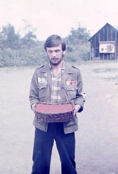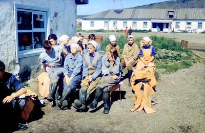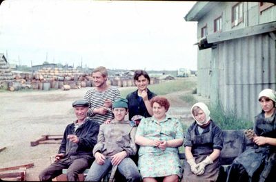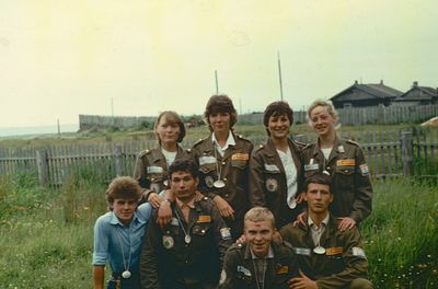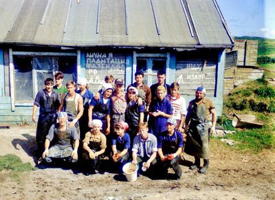 У рыбцеха в п.Пионер, Итуруп Верхний ряд - кто-то местный - ещё один - Андрей Овсяников - местная барышня - Оля Усова - за ней Саня Чащин - Вова Соколов (в галстуке по центру) - Галя Нельга (Григорьева) - за ней Саша Оларь - Катюха Данильцева - за ней Влад Шульгин - Влад Ширяев (тоже в галстуке) - и Иван Иванович Милюкин Нижний ряд - Костя К - Жованник Лена - Оксана Тригубова - Андрей Момзиков с ведром браги и рюмками - Таня Тригубова