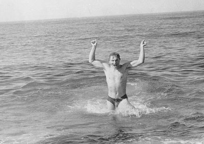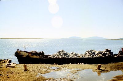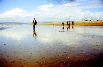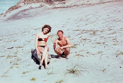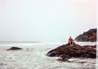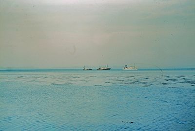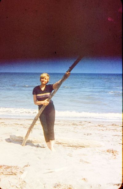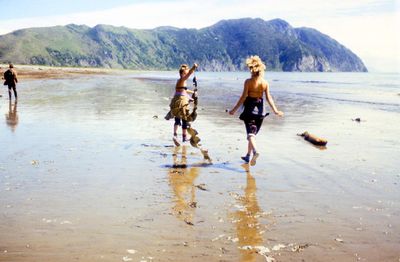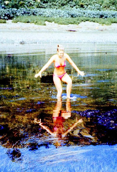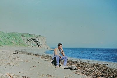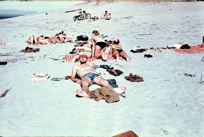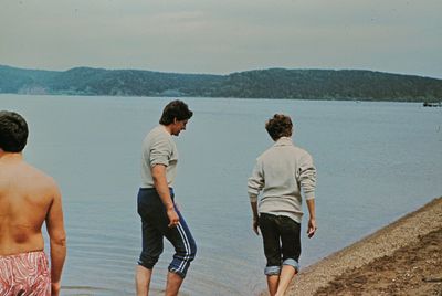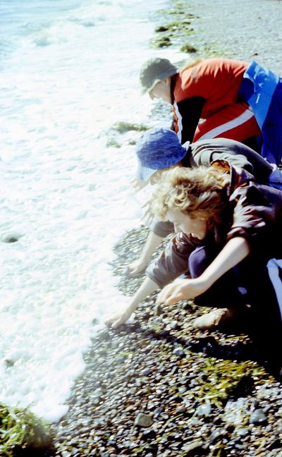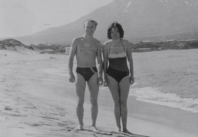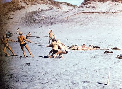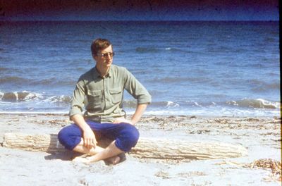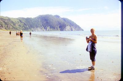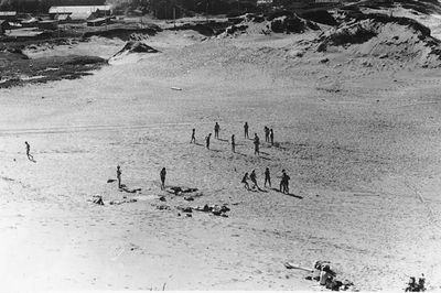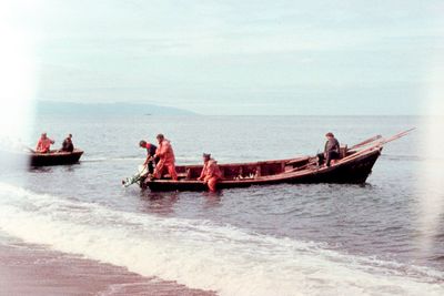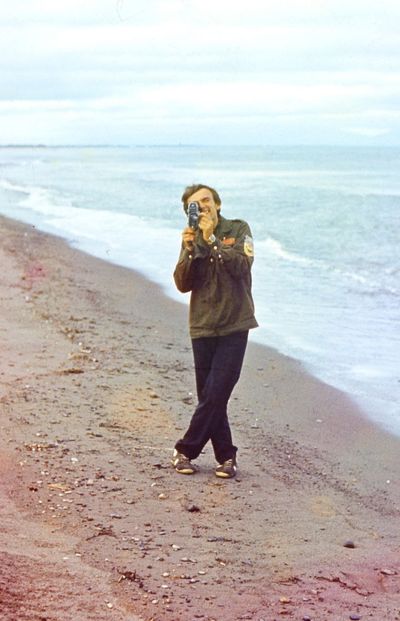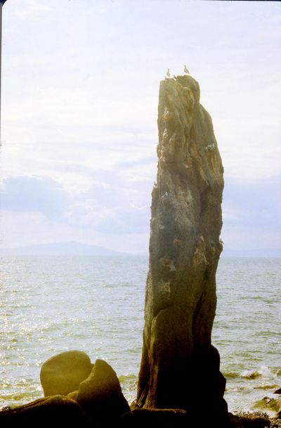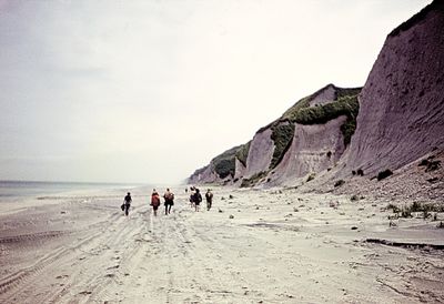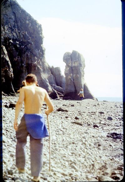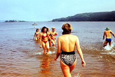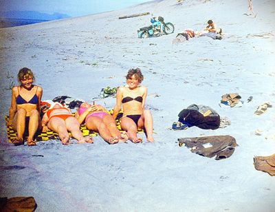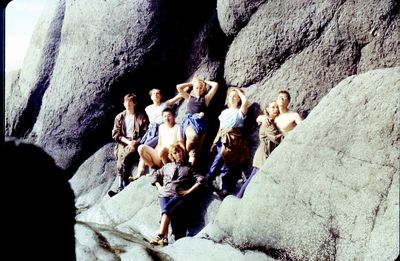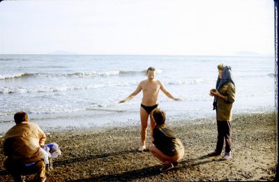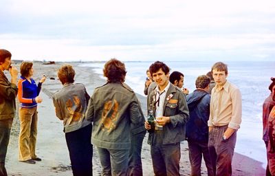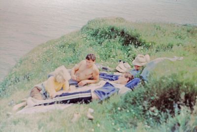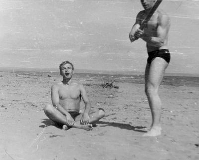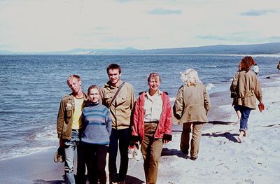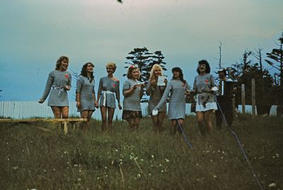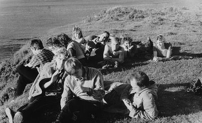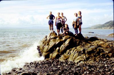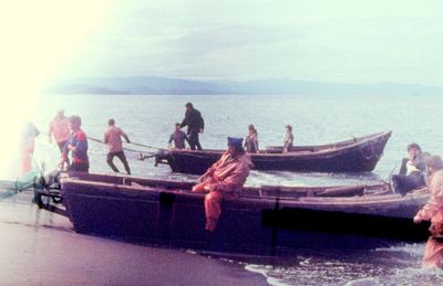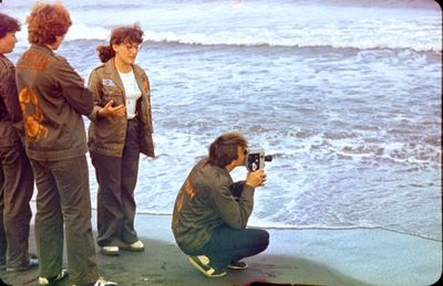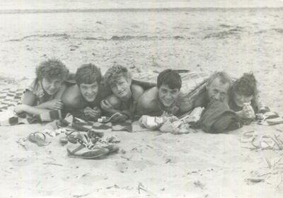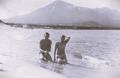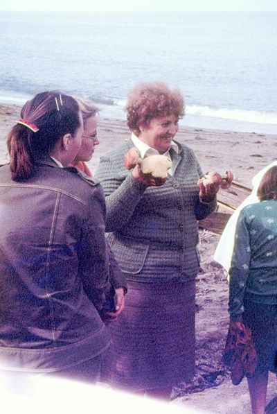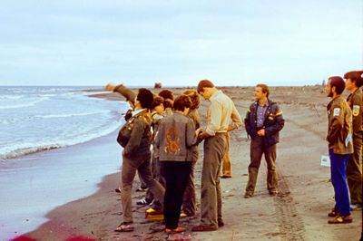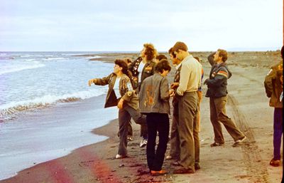 На берегу Анивского залива слева направо на переднем плане ? 2-ой ряд: Азанова Галя, Бодраченко Таня, ?, Малахова Ира, Азова Эля на заднем плане: Павликов Боря, Ягодин Олег