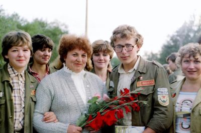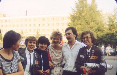 Отъезд домой. Южно-Сахалинск слева направо сидят : Вагнер Лариса, Качаева Таня, Сидоренко Оля, Больных Оля, Осинцева Лена, Щёткина Галя, Зятьков Саша стоят : Жигадло Алексей, Хабидулина Марина, Сургутскова Галя, Ерёмина Ира, Лапшина Ира, Браже Валя, Макушкина Наташа, Молчанова Таня