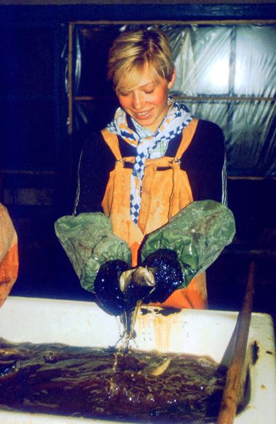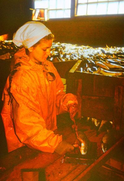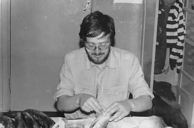 Яша Коренев выбивает из рыбы соль.