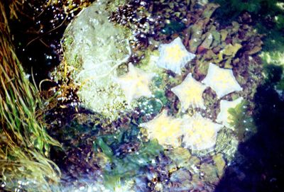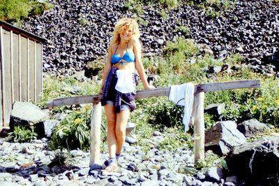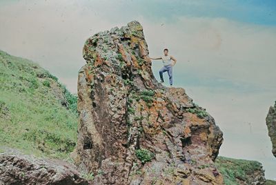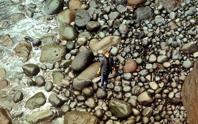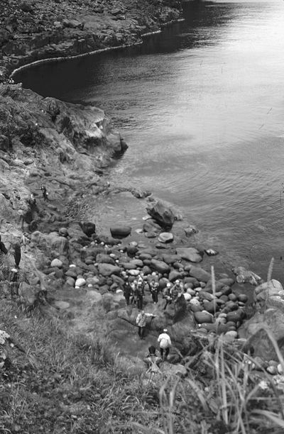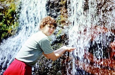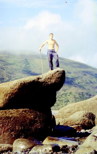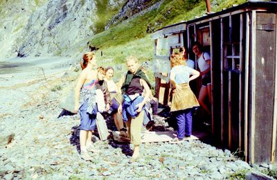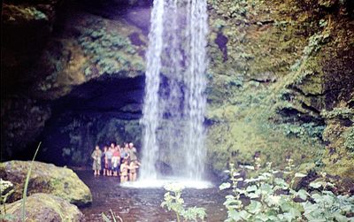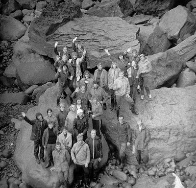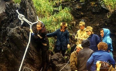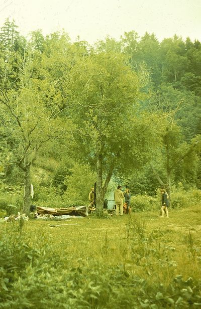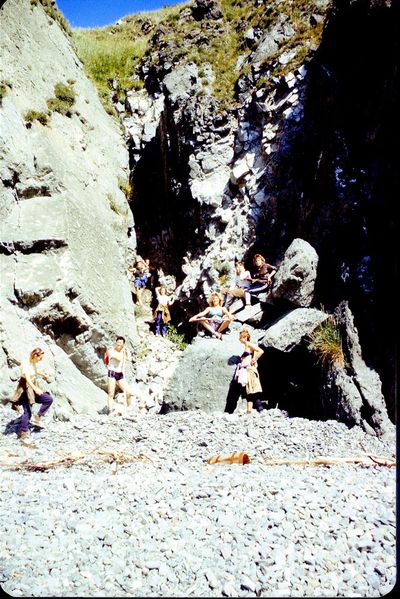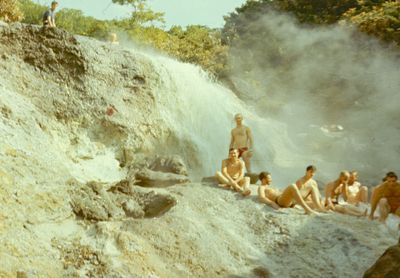 На сернистой речке (помню что их было 3 горячих, возможно эта как раз третья с терпимой температурой около 45 градусов). В верху, над водопадом Рыжов Юрий, Овсянкина Майя; снизу Хоменко Игорь, Пляскин Юрий. Топоровский Виталий, Винник Александр, Фирсанов Константин, Панов Юрий, Занин Владимир.