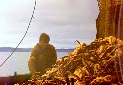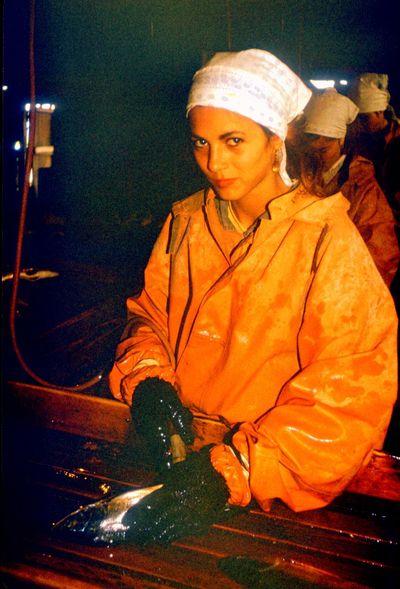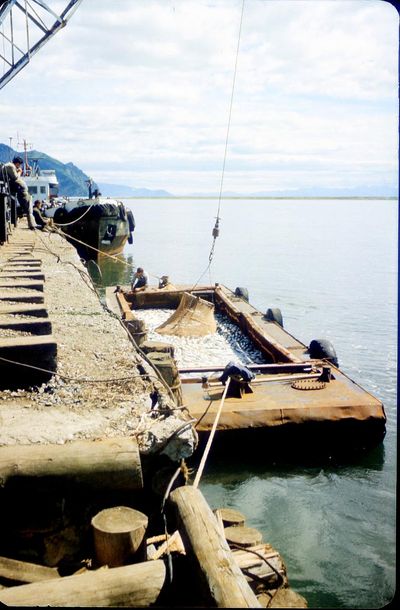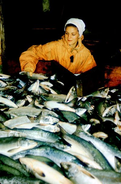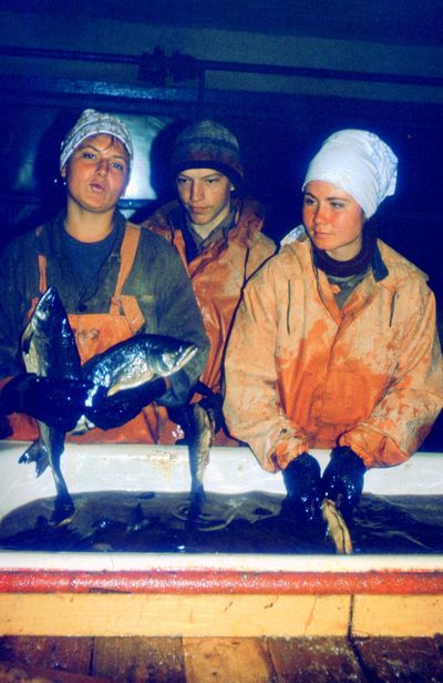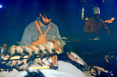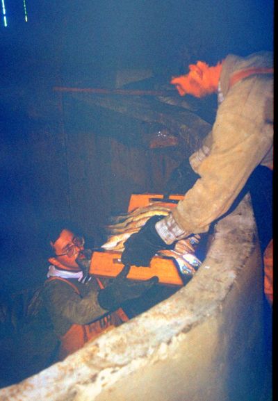 Таня "Солнышко" Савченко с Семёном Теслей контролируют приём рыбы.