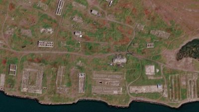 На спутниковом снимке видно 2..3 целых дома, в которых, возможно, кто-то продолжает жить. Также видны руины цехов с хорошо различимыми чанами. Круглой формы - для посола сельди, прямоугольной - для рыбы лососевых пород.