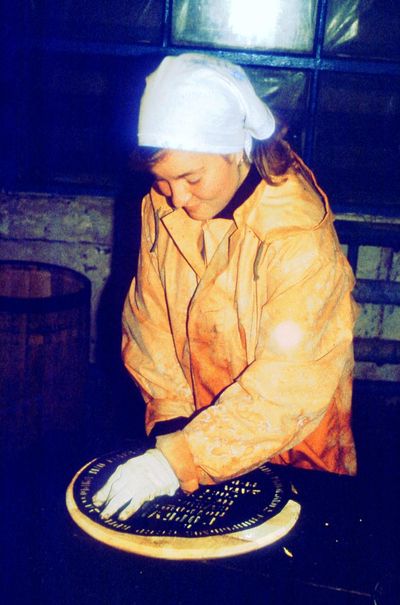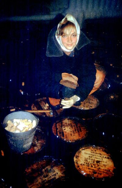 Таня Савченко укупоривает бочки с селёдкой. Или как правильно назвать процесс вколачивания в бочку чопика - чипирование, или чопирование?